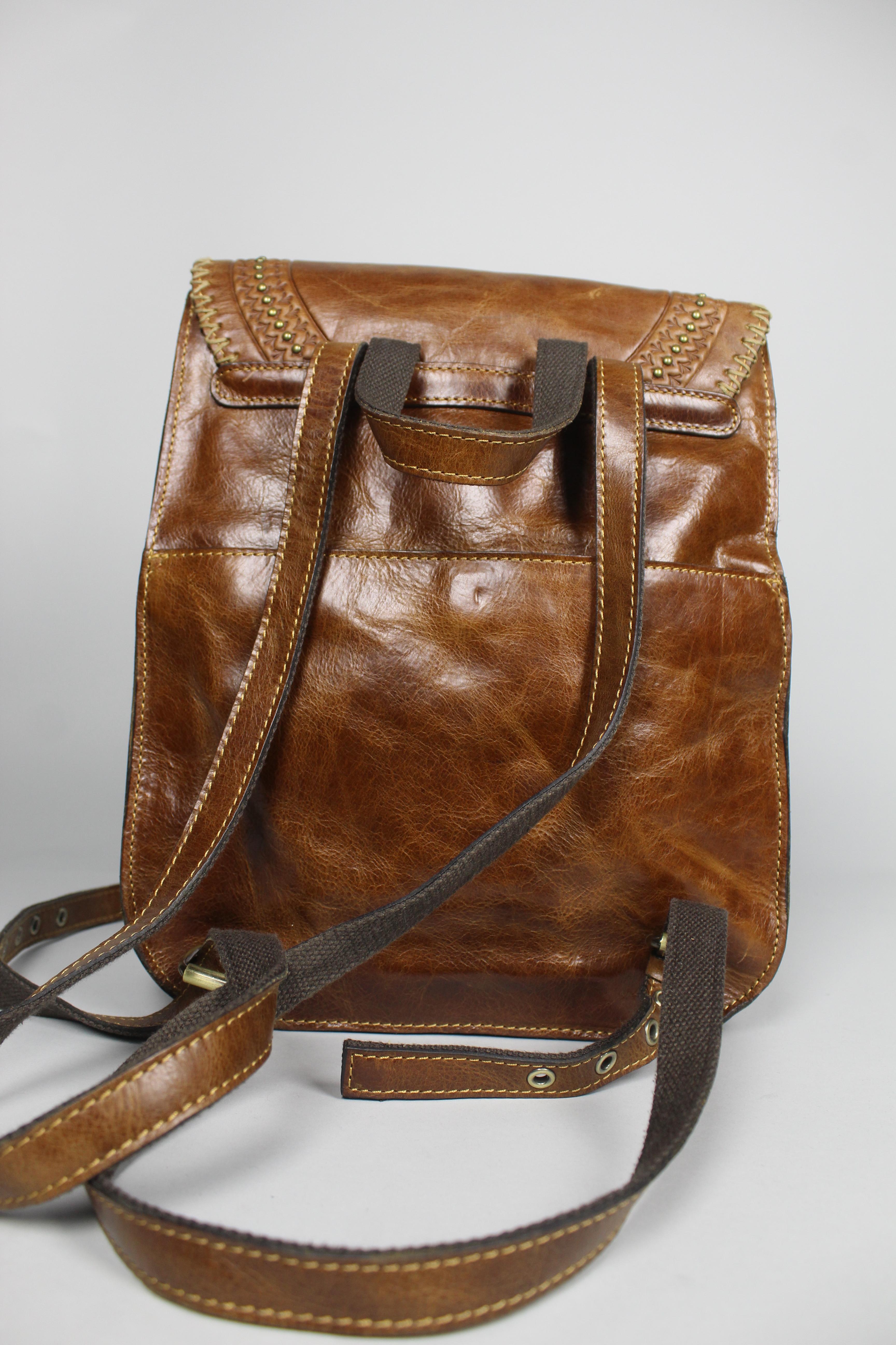 CARTERA/MOCHILA, COLOR CAFÉ, MARCA PATRICIA NASH ITALY, TALLA TU, DE CUERO, TEMP. PRIMAVERA-VERANO, 11CM (PROFUNDIDAD) X 27CM (ANCHO) X 31CM (ALTO), PRODUCTO CON DESGASTE.